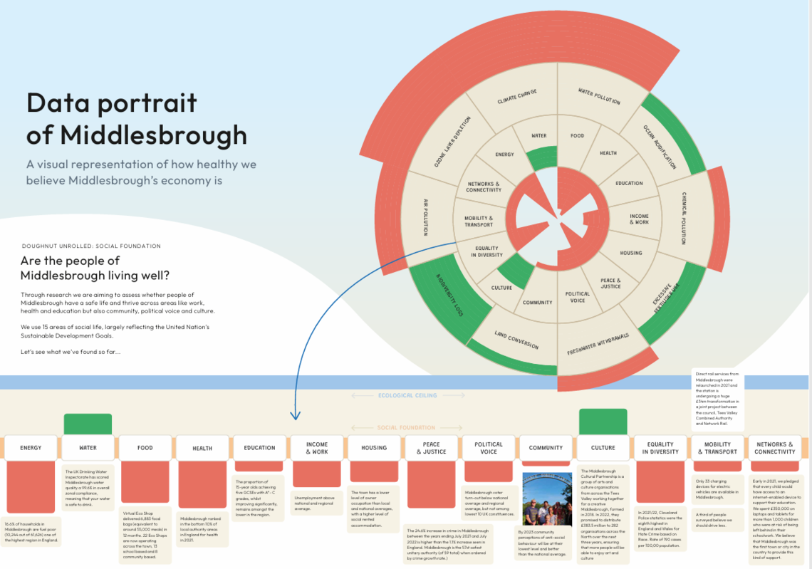 Research current state of Middlesbrough in terms of Doughnut Economics categories of ecological planetary boundaries and social foundation (SDGs). Visualise and present in blogs and social media. Great opportunity to showcase your skills.